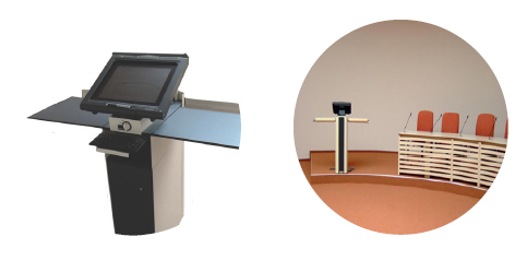 It has the same audience-side look as our Synergy lectern systems, with comfortable handrails and all the functionality you are used to from us, like a microphone, a reading light and various side tables options.
