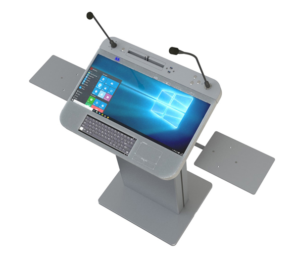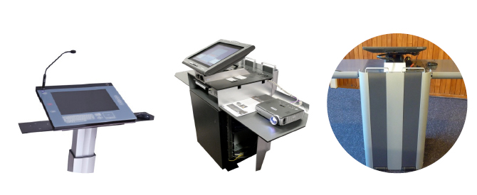 The company developed the Synergy-Universal method that will allow conversion of one lectern into another type within a minute. This is a particular useful feature for rental companies and corporate venue support groups. Lecterns required to be presidential one moment with a nice wood or acrylic surface and become a large touch technology surface another time. This supports both the users preferring a direct presentation style as well as those keen to maximize use of interactive technology.